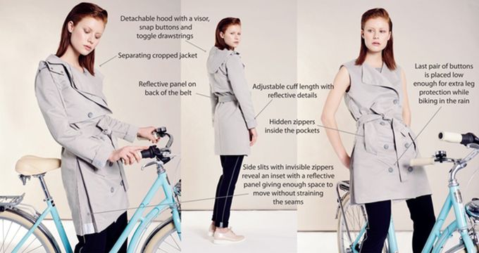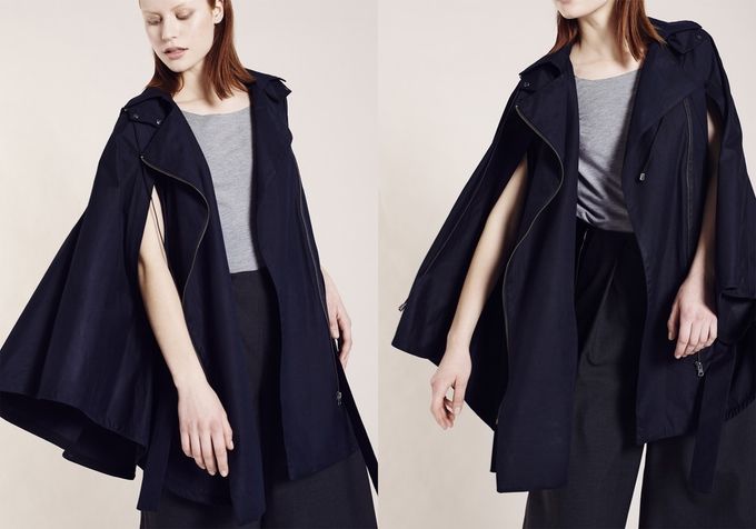 Seit 2011 entwirft sie neben Hosen und Shirts auch Capes und Jacken, die nicht nur schön aussehen, sondern auch multifunktional einsetzbar ist. Multifunktional klingt zwar immer ein bisschen nach Jack-Wolfskin-Zipperhosen mit Atmungslöchern, aber Ivanova hat nicht umsonst den German Design Award und den Preis der Kultur- & Kreativpiloten Deutschland gewonnen. Ihr Trenchcoat ist perfekt geeignet für Spontanschauer, denn er lässt sich sowohl als Weste wie auch als Mantel tragen. Damit die Jacke nicht wie ein Sack über dem Körper hängt, gibt es einen Gürtel, der sogar reflektiert, damit einen auch der kurzsichtigste Autofahrer nicht übersieht.