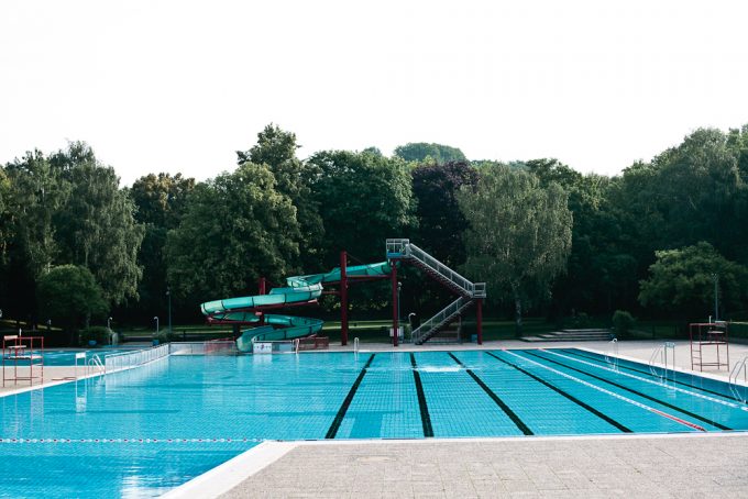 Wenn man früh am Morgen, zwischen 08.00 und 10.00 Uhr kommt, hat man das 50 Meter Becken fast für sich allein. Danach füllt es sich aber angenehm mit allen Schichten der Stadt. Natürlich gibt es Pommes rotweiß, eine anständige Rutsche und die so lange nicht mehr gehörte Ansage vom Bademeister: »Bitte nicht vom Beckenrand springen!« Bei der ich mich immer frage: Warum eigentlich nicht? Habt ihr schon mal von einem Unfall gehört? Die oberflächliche Recherche hatte keinen Treffer und wenn man wirklich auf jemanden aus Versehen drauf springt, kann ja immer noch einen Lutschfinger als Wiedergutmachung ausgeben.