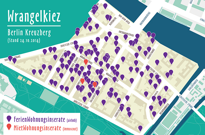 Richtig ist dieses Verbot insofern, als dass immer mehr Wohnungen in Berlin gar nicht mehr auf dem Wohnungsmarkt erhältlich sind, weil sie teuer bei airbnb angeboten werden – wie diese Grafik von Alice Bodnar aus dem Oktober 2014 zeigt:
