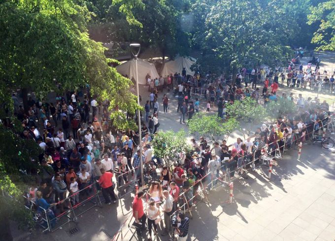 Kein Wasser, keine Nahrungsmittel und keinen Schlafplatz. Hunderte Flüchtlinge campieren seit Tagen – zum Teil nur auf Pappkartons und ohne Schlafsack – vor dem Landesamt für Gesundheit und Soziales (LaGeSo) in Moabit, der ersten Anlaufstelle für Flüchtlinge in Berlin. Sie warten hier in Schlangen, um einen Termin für einen Abfertigungsschein zu erhalten, der ihnen nach erneutem Anstehen einen Unterbringungsplatz oder Gutscheine für eine Übernachtung zuweist.