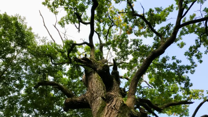 Am Wegesrand gibt mehrere uralte große Bäume, die man trotz lauter Wald einzeln bestaunen kann. Zu den "Naturdenkmälern" gehören die Königseiche, die Grenzeiche und die Frühstückseiche. Über 400 Jahre sind sie alt und man bekommt sofort den Hippie-Impuls, die Bäume zu umarmen, wenn man über die rissige Rinde streicht.