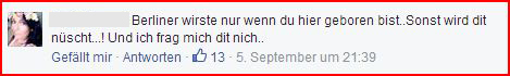 Wie gesagt, ich kenne ein paar gebürtige Berliner. Und soweit ich weiß, haben die sich noch nie mit dieser Frage beschäftigt. Es ist ja auch so kleinbürgerlich. Und vor allem: Als sich beispielsweise die Japaner um 1900 über Zuwanderung und fremde Einflüsse gesperrt haben, ist das zwar auch skurril, aber immerhin damit zu erklären, dass ihre Kultur sich davor über Jahrhunderte vollständig isoliert hat. Berlin dagegen war von Anfang an ein Ort der Zuwanderung. Aber das führt jetzt zu weit.