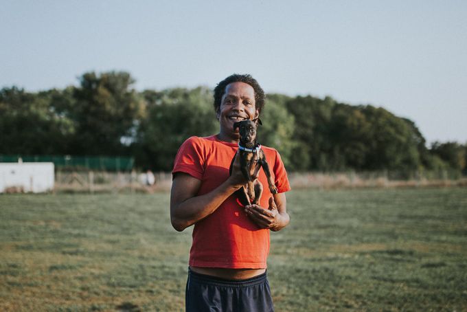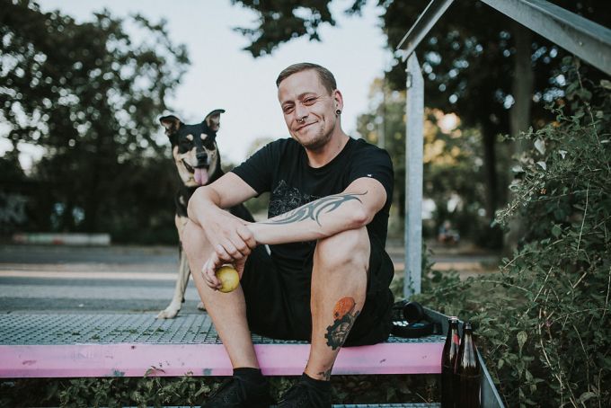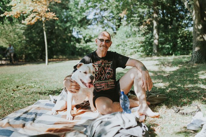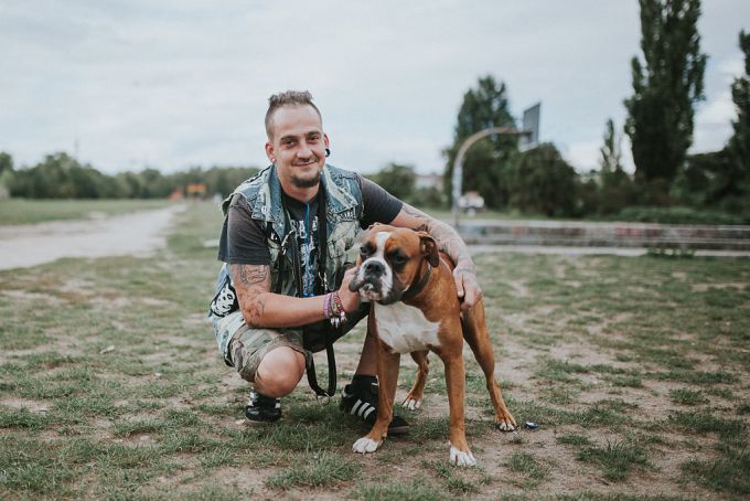 „Papprika ist genauso schwierig wie ich, aber zusammen sind wir ein gutes Team. Er kam mit 5 Monaten zu mir und hat mir so’n bisschen das Leben gerettet. Hätten wir damals nicht zueinander gefunden, wären wir wohl beide nicht mehr. Als Hundebesitzer trifft man im Kiez eigentlich immer die gleichen Leute. Man kennt sich irgendwie, sitzt zusammen, trinkt ein Bierchen, quatscht. Was mich an manch anderen nervt, ist, wenn sie die Kacke liegen lassen. Das fällt dann natürlich gleich auf alle mit Hund zurück. Sonst gibt es viel zu wenig Verständnis für Leute mit Hunden. Die Wohnungssuche ist eine Katastrophe. Alle wollen streicheln, aber das, was dazu gehört, will niemand.“