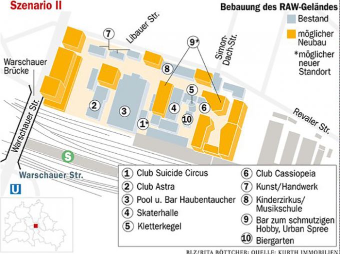 Im März 2015 berichteten wir das letzte Mal ausführlich über das RAW-Gelände. Damals wurde bekannt, dass die Kurth Immobilien GmbH den Westteil des Geländes mit Astra, Urban Spree, Cassiopeia und Suicide Circus für 20 Millionen Euro kaufte. Seitdem schwieg sich Lauritz Kurth, Juniorchef der Kurth-Gruppe, über die Pläne für das Gelände aus und ließ die Clubs im Unsicheren über ihre Zukunft. Gleichzeitig versicherte er aber, dass die bisherige kulturelle Nutzung erhalten beziehungsweise ausgebaut werden solle.