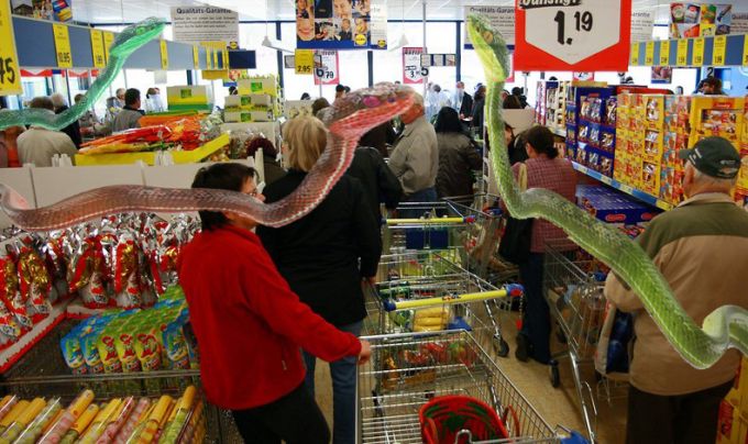 Die Gemüsedönaconda ist sowohl Pflanzen als auch Fleischfresser und in der Regel ca. 70m lang. Diese nimmersatte Schlange sollte man nicht unterschätzen, denn jeder Biss kann tödlich sein.