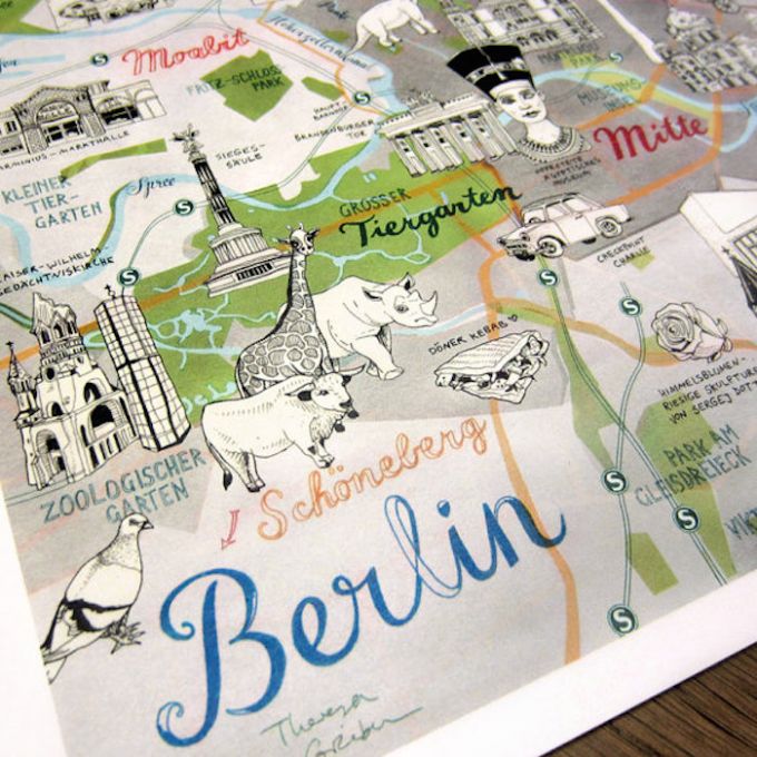Seit nunmehr zwei Jahren betreibt sie ihr Label TheresaGrieben mit zugehörigem Online-Shop und teilt sich mit anderen Künstlern zusammen ein Atelier, das in einer alten Kirche untergebracht ist. Dort entstehen auch die Postkarten zu ihrer Heimatstadt. Tiere und Pflanzen gibt's zu sehen, aber vor allem viel Berliner Charme – eine gezeichnete Liebeserklärung an die Hauptstadt zum um die Welt schicken.