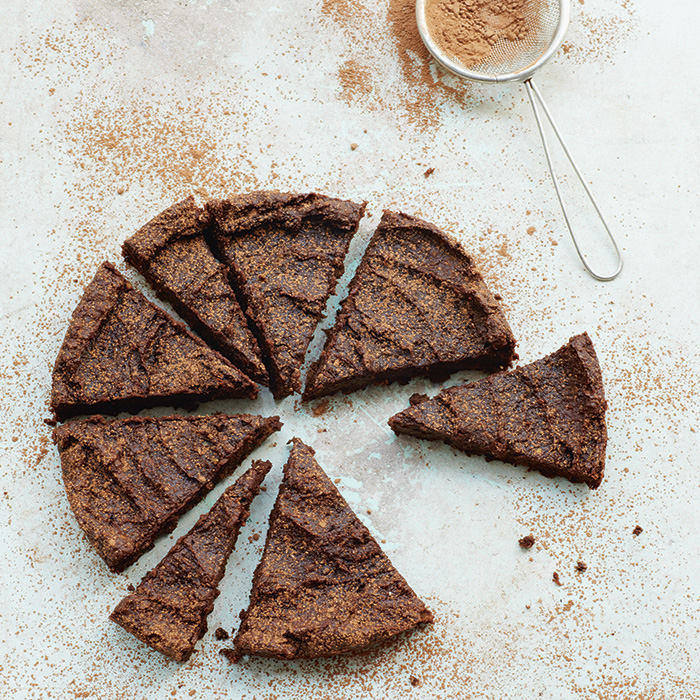 Kokosöl, für die Form | 3 Avocados | 7 EL Mandelmus | 8 EL Rohkakaopulver, plus etwas mehr zum Bestäuben (optional) | 11 EL Ahornsirup | 140 g gemahlene Mandeln | 3 EL Chiasamen | Für die Glasur: 4 EL Kokosöl | 4 EL Rohkakaopulver | 4 EL Ahornsirup