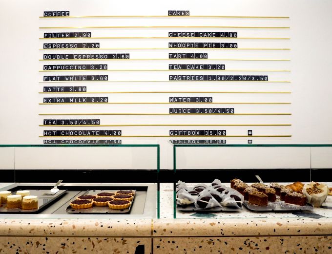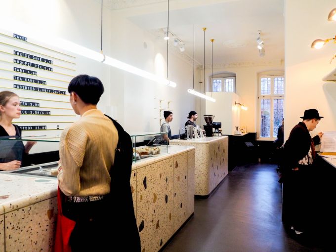 Das Design ist modern und schlicht mit Art Déco-Anleihen und fügt sich damit hervorragend ein in den zeitgeistigen Mitte-Stil. Der abgerundete Tresen aus Terrazzo ist das Herzstück des Ladens, denn er ist nicht nur Schaufläche für fantastischen Kuchen und Kleingebäck, sondern beherbergt auch sämtliches Zubereitungsequipment, das sonst auf der Theke steht und Cafés sonst schnell wie einen Maschinenraum wirken lässt.