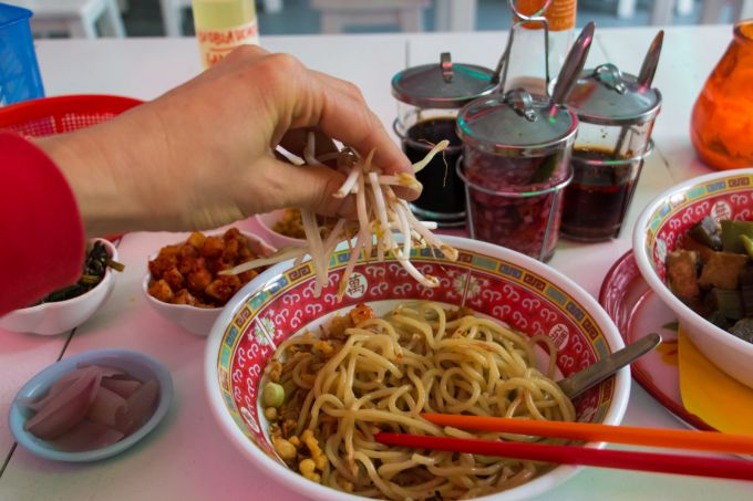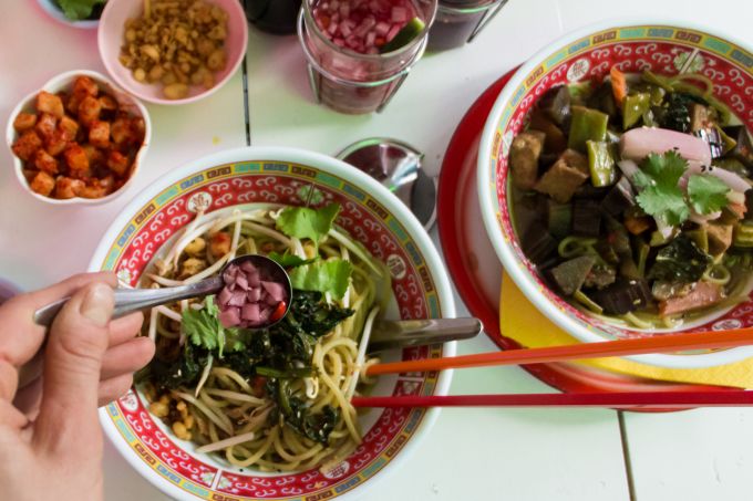 Dieses gesellige Baukastensystem hat Panda Noodle am Lausitzer Platz nicht nur für das Anrichten, sondern auch für das Angebot der Speisen übernommen: Besitzerin Daeng sucht sich aus verschiedenen asiatischen Kulturen besonders leckere Rezepte und Zutaten heraus und kombiniert sie passend. Das Rezept für die Nudeln kommt zum Beispiel ursprünglich aus Japan und viele der Beilagen aus der chinesischen Küche.