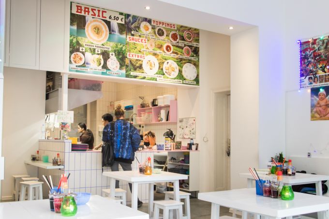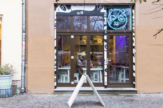 Für Entscheidungsschwache gibt es auch wechselnde Suppen, die im Winter das Herz wärmen und bereits fertig kombinierte Nudelteller. Während das helle und fröhliche Innere mit bunten Lichtern und herrlichen Asia-Trash-Bildern an den Wänden aufwartet, hat das Essen nichts mehr mit dem pappigen Nudelbox-Geschmack zu tun. Alles, sogar die Nudeln, sind frisch selbstgemacht und man sieht die liebenswerte Crew fleißig hinten in der Küche vor sich hin werkeln. Schön! Ein schmackhafter Exkurs in die asiatische Esskultur und die Freundschaft mit dem zwinkerndem Neon-Panda über der Tür kann beginnen!
