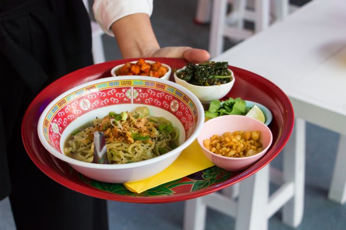 Dieser vielfältige Mix funktioniert dann so: Zu einem Nudelteller, der mit ein wenig Brühe angerichtet wird, sodass die Nudeln schön saftig, aber nicht zerkocht im Mund ankommen, kann man verschiedene Beilagen bestellen. Sprossen, asiatische Croutons, Öle und Kräuter bekommt man immer umsonst dazu. Und los geht’s mit dem Ausprobieren von verschiedenen Geschmacks- und Zutatenkombinationen.