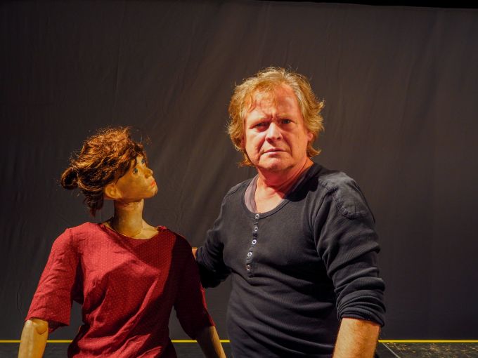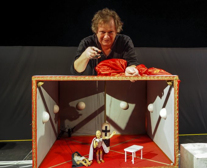 „Haben wir ein Kissen?“, fragt der Marionettenspieler. „Ich brauch ein Kissen.“