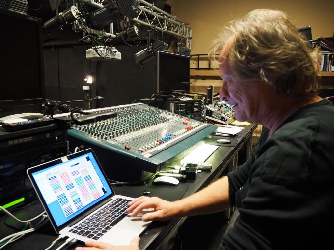 Gegen Mittag beginnen die mühsamen Stunden, in denen wir das Stück einleuchten. Während die Studenten an die 50 Szenen nachstellen, baut Jochen mit den Beleuchtern die passenden Stimmungen dafür. Ich mag den spöttischen Umgang, den alle miteinander pflegen. Offensichtlich arbeiten sie gut zusammen.