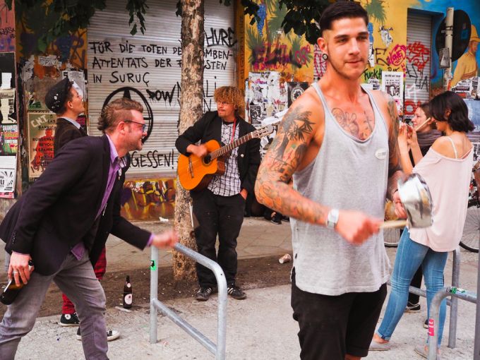 Ich gehe zurück zum „Dorfplatz“, wie die Anwohner die Kreuzung Liebig, Ecke Rigaer nennen. Unter einem Schild mit der Aufschrift "HUNGERSTREIK" sitzt eine Gruppe von Leuten, die mich den ganzen Tag schon spöttisch gemustert haben. Sie bieten mir einen Platz auf einem leeren Bierkasten an.