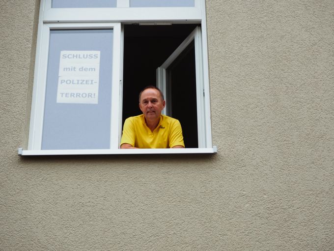 Mein Blick fällt auf ein Fenster in einem sanierten Altbau. Ein Plakat klebt an der Scheibe: "SCHLUSS mit dem POLIZEI-TERROR!" Noch während ich es fotografiere, wird das Fenster von einem Mann im gelben Hemd geöffnet.