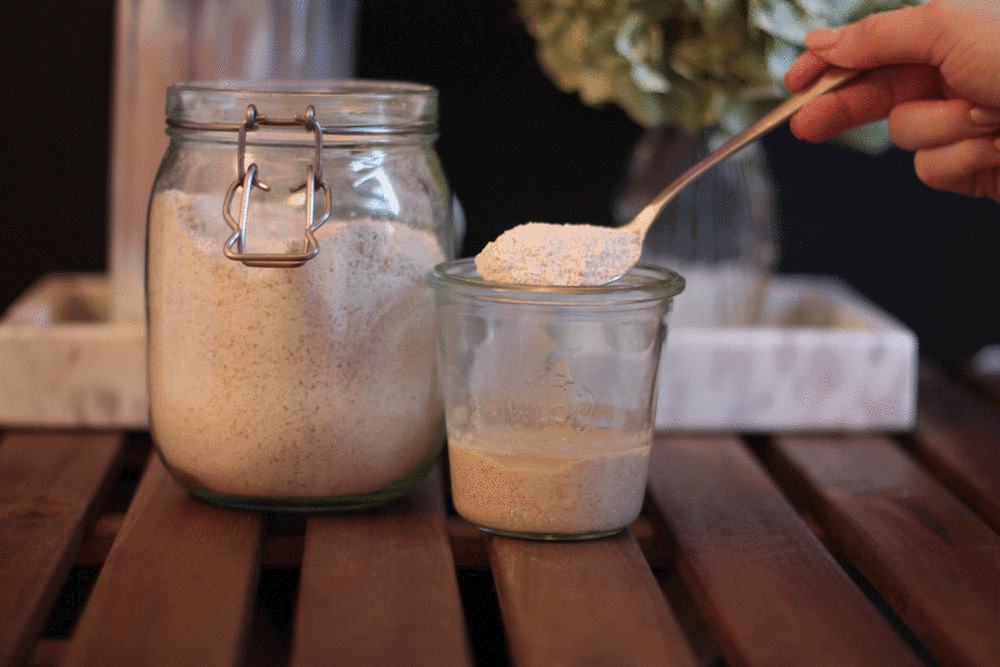 Vor der Brotzeit muss aber erstmal gebacken werden. Dafür braucht ihr ein sogenanntes Anstellgut, kurz ASG. Für das Starterpack des Sauerteigs gebt ihr 50 Gramm Bio-Vollkornmehl (Rogge, Dinkel oder Weizen, ganz egal) und 50 Gramm warmes Wasser in ein Weckglas. Ein leeres Gurkenglas mit Deckel tut’s auch, Hauptsache es lässt sich schließen. Für das ASG solltet ihr euch gutes Mehl besorgen. Wir raten vom industriell gefertigten ab und empfehlen Bio – also lieber auf Qualität setzen, statt auf kleine Preise. Wenn ihr Zeit sparen wollt, könnt ihr das Anstellgut, auch “Natursauer” genannt, im Supermarkt oder direkt beim Bäcker kaufen. Aber wenn schon selber machen, dann doch bitte richtig.