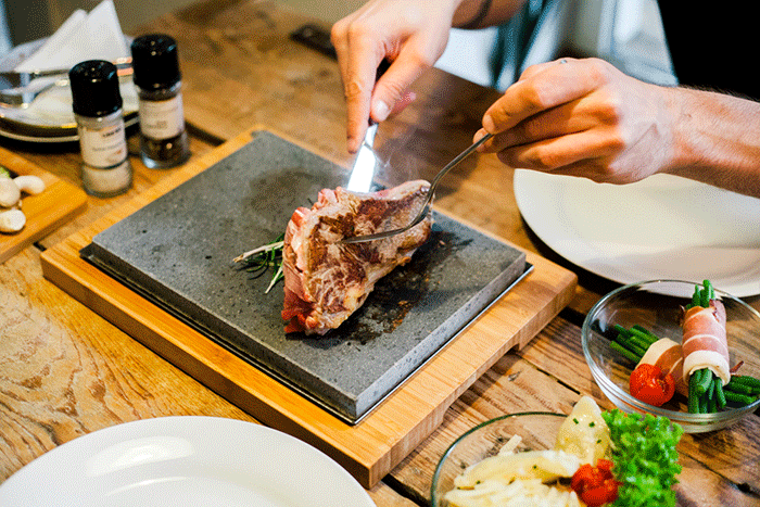 "Hereinspaziert in die gute Stube", möchte man fast sagen, wenn man das Stock & Stein in Friedrichshain betritt: an der Wand ein Birkenwald, die Möbel holzig, links große Kupfertanks, rustikal angehaucht und gleichzeitig modern. Doch bevor jemand fragt, Besitzerin Stefanie ist weder eine große Wanderin noch liebt sie Almhütten. Der Stein im Namen von Stock & Stein bezieht sich vor allem auf das, was man hier serviert bekommt: einen 350° heißen Coderit-Stein, auf dem man sein Essen selbst braten kann.