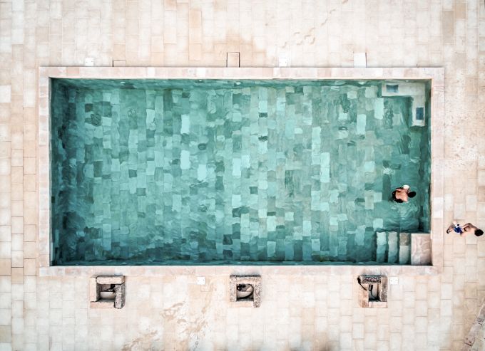 "Wie bei einem Gemälde von David Hockney bilden das kühle, smaragdgrüne Wasser und das lichte, warme Terracotta einen starken Kontrast. Dieser ist jedoch durch die durchgängige Struktur des Bodens fließend – als hätte sich ein Photoshop-Filter über das Bild gelegt. Allein die Menschen zeigen, dass es authentisch ist."