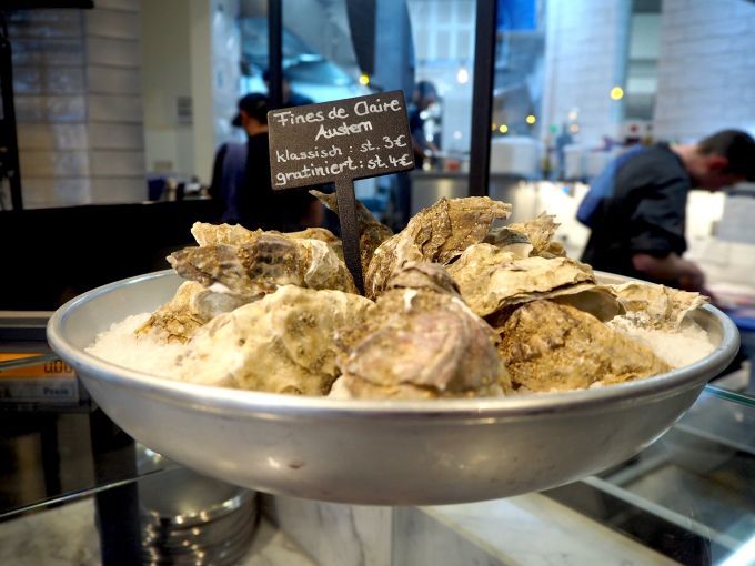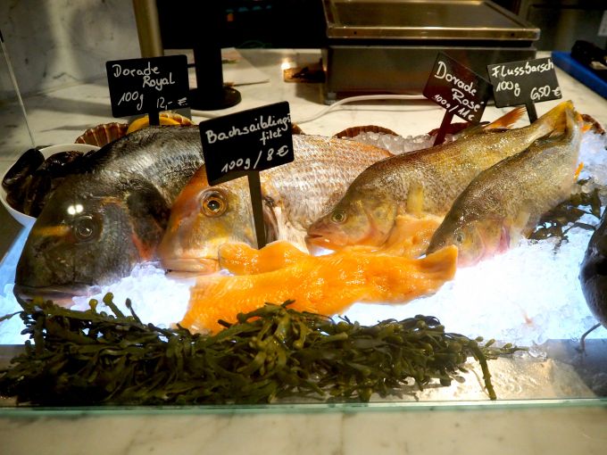 An der marktähnlichen Fischtheke kann man sich entscheiden, wie viel Gramm des frischen Fisches es sein soll und eine der drei Zubereitungsarten wählen: Gebraten, gegrillt oder gedämpft. Wer kein Kenner ist, kann sich beraten lassen oder den sogenannten „Catch of the day“ als Hauptspeise probieren. Vorher sollte man aber nicht verpassen, die schönen Holztische mit verschiedenen Schüsseln der saisonal angepassten Auswahl an Vorspeisen von Crevetten über Ceviche bis hin zu Austern zu füllen, das hausgemachte Brot in die verschiedenen Dips zu tunken und mit einem der herrlichen Weine anzustoßen.
