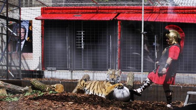 Eine schwarze, vergitterte Arena, darin vier Tiger und ein Mann in einem Imperator-Kostüm. Auf einem schwarzen Banner darüber: "Flüchtlinge fressen – Not und Spiele". Vor dem Maxim Gorki Theater in Mitte spielen sich etwas ungewohnte Szenen ab, die man eher in einem Film über das Römische Reich mit Brad Pitt in der Hauptrolle vermutet als 2016 in Berlin. Das, was sich hier abspielt, changiert irgendwo zwischen bitterem Ernst und zynischer Realitätsabbildung.