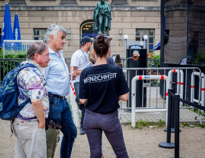 Vor dem Maxim Gorki Theater werden gerade Geflüchtete gefressen