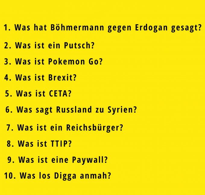 Was ist unsichtbar und riecht nach Hase? Richtig, ein Kaninchenfurz. Aber der Witz ist so unfassbar alt, dass er deshalb bei Google jährlich nur noch ca. 10 bis 15 Mal abgefragt wird. Dafür stehen einige heikle politischen Themen in den Top-Positionen der "Wie-Fragen-Charts". Ob ein Putsch genauso reinhaut wie eine Bowle oder ein Eimer Sangria weiß nicht jeder und wer Google nicht fragt, bleibt nunmal außen vor (dumm).
