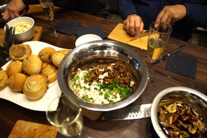 Wenn man hier im Dunkeln ankommt, leuchtet The Hidden schon von außen, sodass wir uns beim Eintreten sofort fühlen, als würden wir nach Hause kommen. In der Küche empfängt uns Daniel, der gerade mit einem Blick in den Ofen nach dem Marmorbrot schaut, bevor er dann noch schnell die selbstgemachte Salzrauchbutter umfüllt und auf dem großen Küchentisch platziert. Diese beiden Sachen sind dann aber auch die einzigen Dinge, die schon fertig sind. Beim restlichen Dinner müssen wir, die Kochkursteilnehmer, dann selbst arbeiten.