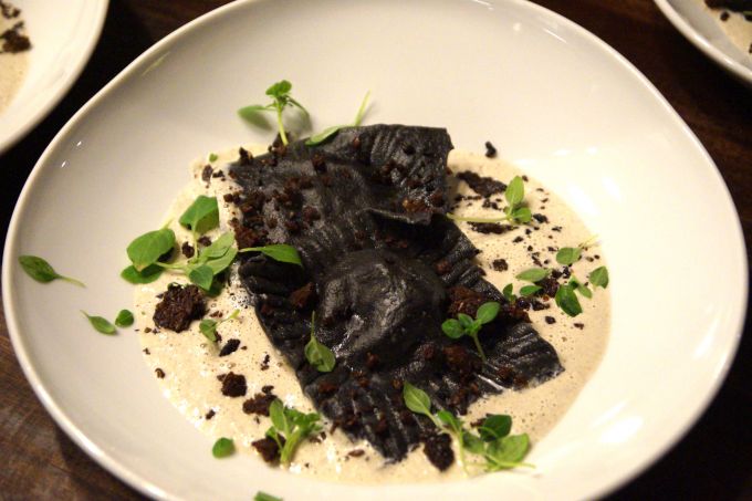 Mit einer sehr lustigen und gemischten Gruppe machen wir uns also unter der Anleitung von Daniel daran, den ersten Gang “Sepia-Ravioli mit Garnelen-Steinpilz-Füllung in einem Pilzschaum mit Pumpernickelkrümeln” vorzubereiten. Es wird geschnibbelt, getratscht, aber auch immer wieder aufmerksam zugehört, wenn Daniel erklärt, wie man den besten Nudelteig hinbekommt oder der Ravioli-Füllung mit Steinpilzsud noch mehr Geschmack verpasst. Während die Ravioli kochen und der Pilzschaum leise simmert, geht es dann weiter Richtung Hauptgang: “Argentinisches Rinderfilet am Stück gegart mit Kräuter-Senf-Kruste, Rotwein-Granatapfel-Butter, Blumenkohl-Kartoffel-Püree & lila Süßkartoffelstroh“. Für die Kräuter-Senf-Kruste schneiden wir gefühlt eine ganze Wiese voller Kräuter klein, während auf dem Herd die Rotwein-Granatapfelbutter einreduziert und die Kartoffeln und der Blumenkohl darauf warten, zu Pürree verarbeitet zu werden.