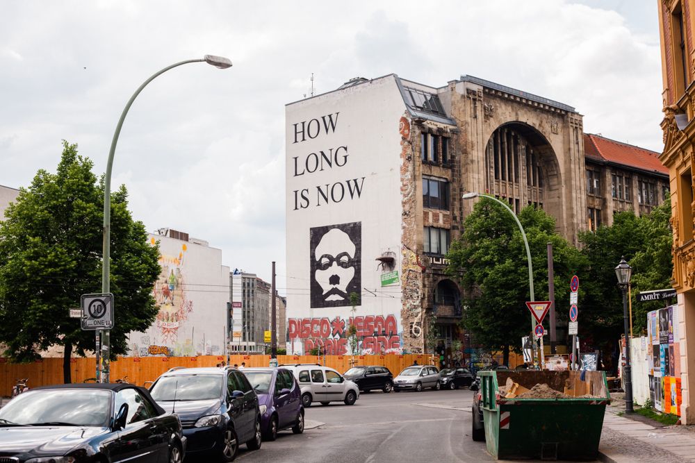 Wir folgen der Gipsstraße wieder nach Norden und biegen nach links in die Auguststraße. Vorbei am berühmten Clärchens Ballhaus kann man hier vor allem eins sehr gut: In die Galerien reinlugen, die Tür an Tür stehen. Schließlich gelangen wir zur Oranienburger Straße mit dem bekannten Wandstencil an der Brandwand des einstigen Kunsthaus Tacheles. Wir verstehen die Frage nicht und biegen nach links ab.