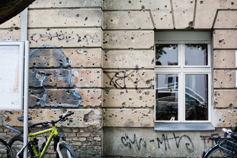 Wieder raus in die gleißende Sonne und ab nach rechts: Kurz nach dem Monbijouplatz biegen wir ein in die Große Hamburger Straße. Hier warten gleich mehrere sehenswerte Bauwerke: Das St.Hedwig-Krankenhaus mit seiner nordisch anmutenden Backsteinfassade, der jüdische Friedhof und die Sophienkirche, wo 1964 Martin Luther King eine Predigt hielt. Am Nachbargebäude: Zahllose Einschusslöcher.