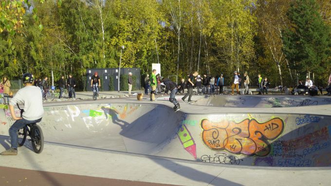 Der Skatepark Hasenheide am Columbiadamm 184 besteht neben der steilen Quarter aus einem Stück der Berliner Mauer, Banks, einem gebogenem und einem geraden Rail sowie einer Vielzahl an Curbs. Hier könnt ihr euch auf großer Fläche an den zusammengesetzten Obstacles austoben oder endlose Lines fahren. Oder ihr schnappt euch einen Basketball und lasst ein paar Dribblings. Direkt neben dem Skatepark sind nämlich auch Tischtennisplatten und eben zwei Halfcourt-Basketballkörbe – leicht schief zwar, aber immerhin mit Platten und Netzen.