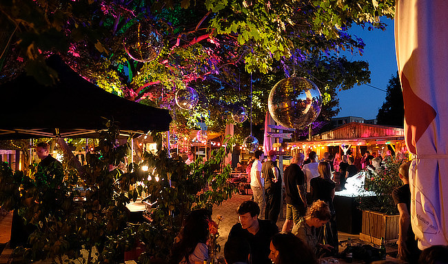 Direkt am Mauerpark gelegen, findet ihr die Strandbar schönwetter*. Da, wo früher einmal die Mauer stand, befindet sich jetzt ein gemütlicher Ort unter freiem Himmel, der Berliner*innen ebenso wie Tourist*innen anzieht. Die Location mit mediterranem Flair bietet euch an warmen Sommertagen alles, was ihr braucht, um ein wenig Urlaubsfeeling aufkommen zu lassen: kühle Drinks, Snacks, Liegestühle im Sand und abends gibt es sogar eine Feuerschale, an der ihr zusammen sitzen könnt. Gleich nebenan findet der wöchentliche Mauerpark-Flohmarkt statt. Perfekt, wenn ihr nach dem Vintage Shopping noch eine kurze Pause einlegen wollt.