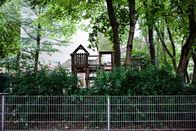 Früher waren Weißensee, Prenzlauer Berg und Pankow noch eigenständige Bezirke, 2001 fusionierten sie zum gemeinsamen Verwaltungsbezirk Pankow. Und obwohl die Bezirke inzwischen eins sind, merkt man doch schnell, dass man jetzt nicht mehr im Prenzlauer Berg ist. Die Häuser werden kleiner, die Straßen ruhiger und vor allem grüner, zumindest wenn man die ziemlich große und, zugegeben, nicht allzu hübsche Berliner Allee verlässt. Ich biege von der Gürtelstraße ab auf die Meyerbeerstraße, wo sich auf der rechten Seite ein wirklich zauberhafter kleiner Spielplatz in dem vielen Grün auftut.