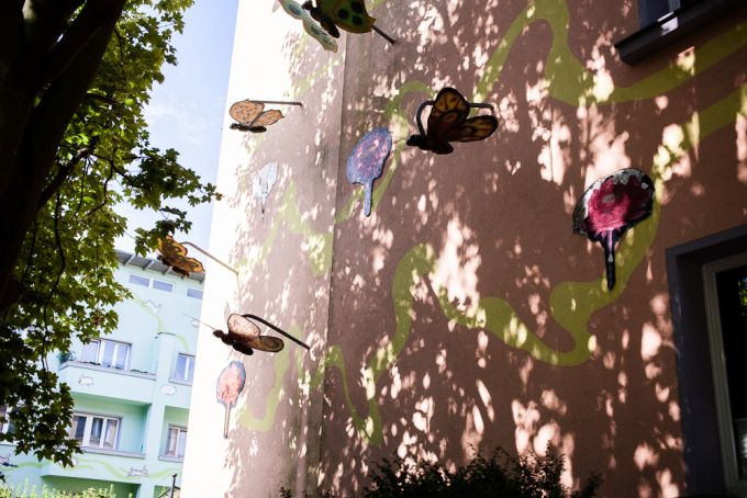 Neben den alten Einfamilienhäusern und den schicken Neubauten am Weißen See verstecken sich in Weißensee aber auch ein paar experimentierfreudigere Architekten. Denn anders kann ich mir diesen kleinen Schatz aus riesengroßen, ausgedruckten Blumen und aus der Wand herausragenden Schmetterlingen in der Gustav-Adolf-Straße nicht erklären.