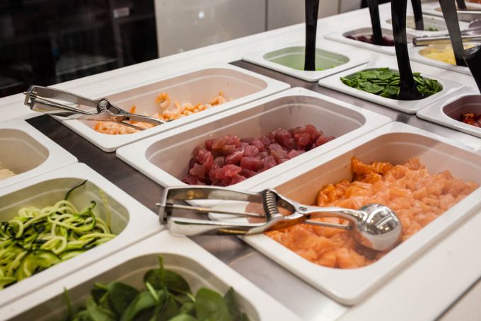 Die Bowls werden direkt vor den Gästen zubereitet. Wenn man sich schnell entscheiden kann, dauert's von der Bestellung bis zum ersten Bissen maximal fünf Minuten. Durch den Reis als Basis macht die Bowl mich ziemlich satt. Wer auf Kohlenhydrate verzichten will, kann auch einfach Zucchini-Nudeln oder Salat als Grundlage für die Poké-Bowl wählen. Für Vegetarier und Veganer gibt es Tofu anstatt Fisch oder Shrimps. Der Lachs ist zart und frisch, das Gemüse knackig, die Guacamole genau richtig abgeschmeckt und die Soja-Sesamsauce nicht zu salzig. Für ein Nachtisch bleibt mir keine Zeit, dafür nehme ich aber einen leckeren Bio-Acai-Smoothie von dem Berliner Food-Startup Wholey.