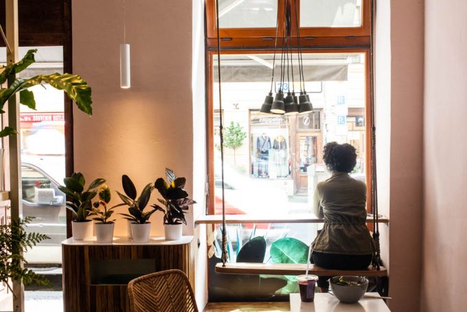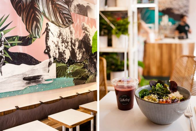 Das kleine Restaurant um die Ecke vom hektischen Hackeschen Markt sorgt direkt für jede Menge Urlaubsfeeling, gute Laune und Entspannung. Der Raum ist voller Pflanzen, gegenüber der Tür stehen zwei Surfboards, die als Speisekarte dienen, dahinter ein goldener Spiegel, der für warmes Licht sorgt. Vor den beiden Fenster laden zwei Holzschaukeln zum Verweilen ein und an den Wänden hängen riesige Collagen aus Fotografien und Bildern.