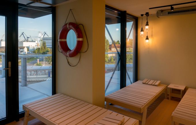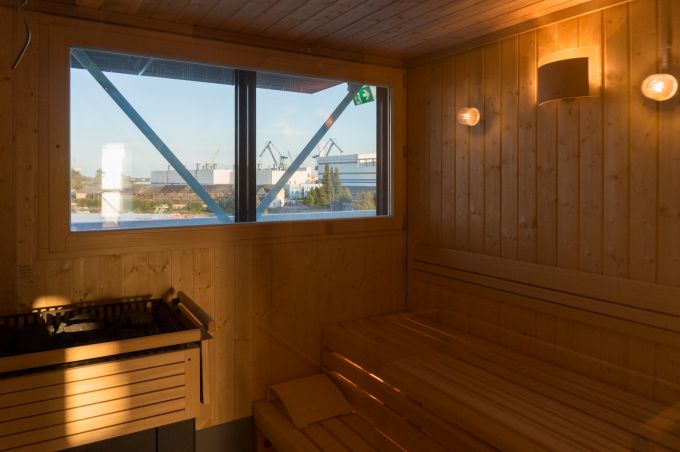 Nach dem Sport ist vor dem Saunieren. Alle Gäste des Dock Inns können von 18 bis 22 Uhr kostenlos die schöne Hafensauna des Hostels nutzen. Mit Blick auf die Werft kann man sich hier entspannen. Dazu gibt's Erlebnisduschen, Fußbecken, Relaxliegen und ein Kissenfloß mit Hafenblick. Danach könnte man sich butterweich im Kopf ins eigene Bette stürzen...