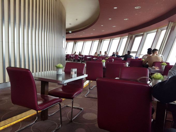 Ich war aufgeregt, wie ein viel zu groß geratender Dreijähriger, der gleich zum ersten Mal alleine Achterbahn mit Looping fährt. Vielleicht vergingen auch deshalb die Minuten beim zweiten, deutlich ausführlicheren Sicherheitscheck, wie im Fluge. Hinter einer Glastür wartete derweil schon ein lustig gekleideter Aufzugführer, der mich und die anderen „Hochfahrwilligen“ nach und nach mit abgeklärten Winkbewegungen in seinen kleinen dunklen Fahrstuhl lockte. Fasziniert mit welcher Konsequenz der alte Liftboy seinen Dienst verrichtete, bekam ich von den 207 Höhenmetern, die wir während der rund einminütigen Fahrt zurücklegten, kaum etwas mit. Der Aufzug stoppte abrupt auf der ziemlich überfüllten Aussichtsplattform und deshalb ging ich ohne Umwege die kleine Treppe hoch zum „Drehrestaurant Sphere“, wo man mir freundlich aber bestimmt Fensterplatz 22 zuwies.