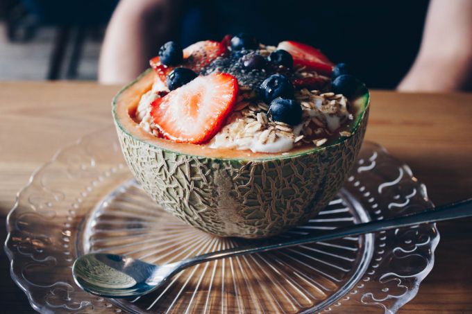 Auf der Brunchkarte lächeln mich besonders die Waffeln mit Beeren und Ahornsirup an. Weil das Waffeleisen leider einen kleinen Schaden hat, muss ich vorerst auf die süßen Belgier verzichten. "Beim nächsten Mal bekommst du die Waffeln auf jeden Fall", entschuldigt sich Jaqueline mehrmals. Wir entscheiden uns stattdessen für den veganen Hummus-Gemüse-Bagel und die Superfood Bowl. Die Bowl ist ein echter Hingucker, wo bekommt man schon ein Goji-Cashew-Granola in einer Cantaloupe-Melone serviert?
