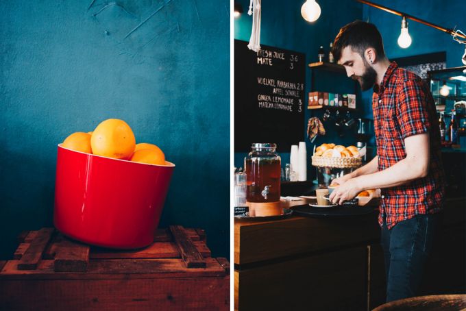 Erstmal Kaffee, davon gibt es hier richtigen guten und zwar von der Berliner Rösterei Five Elephant. Es ist Samstag, kurz nach 10 Uhr und es scheint, als würde Kreuzberg noch schlafen. Außer einer Frau, die es sich draußen unter Palmen bequem gemacht hat, Cappuccino trinkt und Zeitung liest, sind wir die einzigen Gäste. Es duftet herrlich nach Kaffee und Croissants.