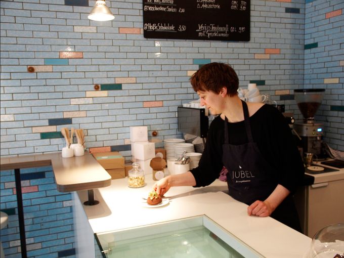 Hinter der Theke steht die 36-jährige Kai Michels, die die Pâtisserie Jubel gemeinsam mit ihrer Freundin Lucie im Herbst 2014 eröffnete. Die gelernte Köchin versteht Läden nicht, die zwar guten Kuchen anbieten, aber grauenhaften Kaffee. Diese Unaufmerksamkeit gilt es in jedem Fall zu vermeiden. „Es war uns wichtig, dass der Laden ein Gesamtkonzept vorweist. Wir haben schicke Kartons, wir haben guten Kaffee, wir haben einen schönen Laden, bei uns muss alles ineinander greifen.“