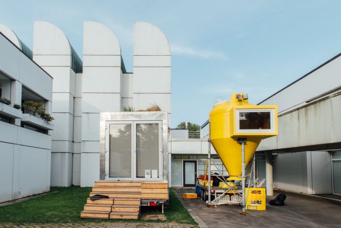 Die Tiny Houses befinden sich im Vorgarten des Bauhaus Archives. Sichtschutz für die Bewohner und Gäste bietet eine kleine Mauer, nur der Lärm von der Straße ist hörbar. Ich habe das Gefühl, mich in einer kleinen Parallel-Welt zu befinden. Über zehn kleine Häuschen auf Achsen stehen für die Öffentlichkeit bereit – und wollen auch begutachtet werden. Einige der Holzhütten sind bewohnt, andere, wie das Café Grundeinkommen oder das Holy Food House, sind als Gemeinschaftsräume gedacht.