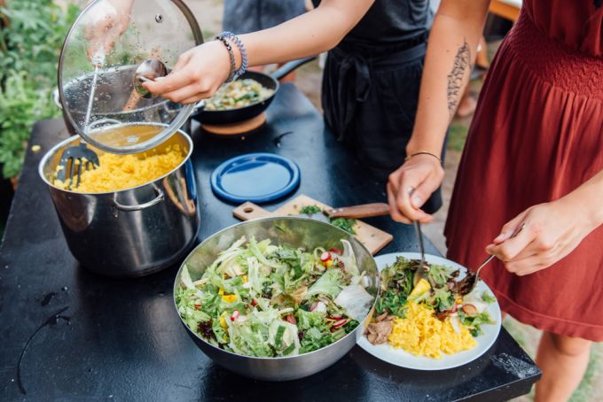 Letztgenanntes lädt jeden Mittwoch zum „After Work Recycled Dinner“ ein. Gekocht wird in dem schmucken Tiny House, das gemütlicher und effektiver nicht sein könnte. Rund um das Haus stehen kleine Hochbeete mit Gemüse und Kräutern sowie der Foodsharing-Fair-Teiler, wo Freiwillige ihre Kisten mit Lebensmitteln reinstellen können. Zwischen den Häusern hängen Lichterketten und einen Sandkasten für die Kleinen gibt es auch. Das Essen für das Recycled Dinner kommt von Foodsharing und über eine Kooperation mit „The Real Junk Food Project“. Die Idee dahinter: Obst und Gemüse mit braunen Stellen sowie Lebensmittel, die teilweise noch vor dem Ablaufdatum aus dem Ladensortiment entfernt werden, finden hier ihre Verwendung.