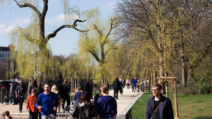 Der Böcklerpark ist ein kleiner, aber wirklich hübscher Park direkt am Landwehrkanal in Kreuzberg. Hier könnt ihr entweder den Schwänen auf dem Wasser zusehen, Fußball oder Basketball spielen und wen der Hunger überkommt, der*die wechselt einfach fix die Uferseiten und kann dann mit Blick auf den Park auf dem Van-Loon-Schiff schnabulieren.