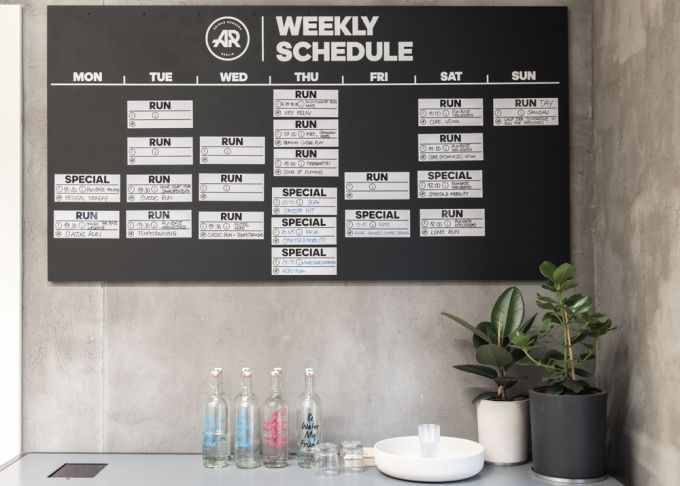 Hat man sich durch die zwei Zimmer durchgestöbert, steht man vor dem Crewraum für die "adidas Runners"-Community. Gelbe Möbel, Pflanzen, frisch gezapftes Wasser und eine große Tafel mit dem Wochentrainingsplan geben Zeit fürs Entspannen, Organisieren und auch Platz für Yogastunden und Seminare.