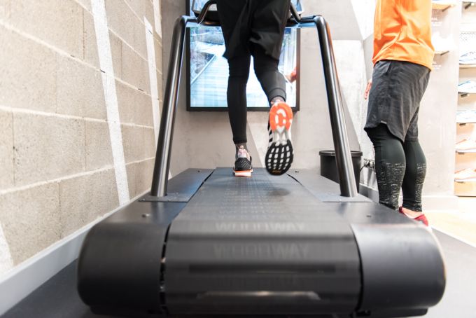 Da wir ja alles sehen und testen wollen, begeben wir uns zum Abschluss zur Laufbahn im Obergeschoss und machen eine Laufanalyse. Tung, ein sehr motivierter Mitarbeiter, bringt verschiedene Schuhe, mit und ohne Fußinnengewölbe-Unterstützung, alle werden von Matze am Laufband getestet. Dank des großen, vertikalen Flatscreens kann man dabei durch New York laufen und mal kurz die Welt rund um sich vergessen. Zusätzlich zu den zwei Laufbändern gibt es aber auch noch die Möglichkeit, die Schuhe auf einer 20 Meter langen Laufbahn zu testen, um sich wirklich sicher zu sein, ob der Schuh denn nun der richtige für einen ist.