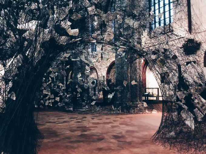 Die Lost Words-Installation von Chiharu Shiota besteht aus vielen einzelnen Fäden die mit internationalen Bibelseiten verwoben sind. Die Verstrebungen symbolisieren die globalen Verflechtungen von Religion. Zum 500-jährigen Jubiläum der Reformation wird die Nikolaikirche mit einem Netz aus Wörtern und Streben zu einem Symbol für den heutigen Austausch von Kultur und Religion.