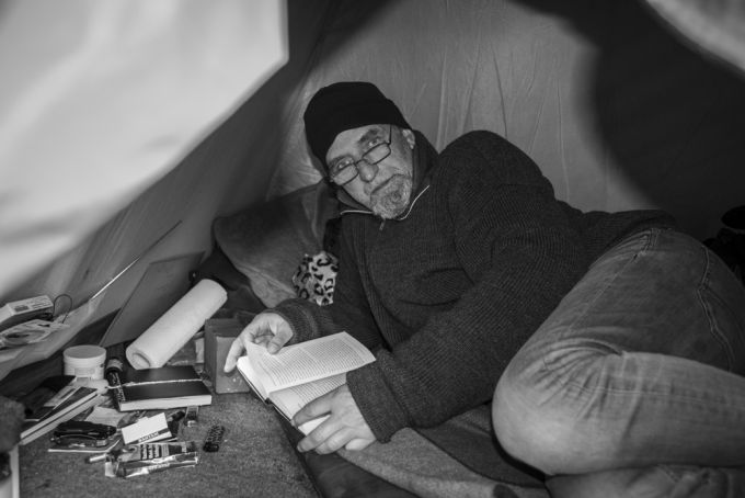 Er und seine Zeltnachbarn bilden eine Art Zweckgemeinschaft. Sie passen aufeinander auf, vereinbaren eine Stelle, wo sie die Zahnbürsten zum Trocknen auflegen. Es gibt einen Gaskocher und eine Plastikschüssel, in der sie Geschirr zum Spülen sammeln. Udo bastelt sich sogar kleine Heizungen aus Steinen und Grabkerzen. Diesen Trick kennt er noch aus seiner Kindheit bei den Pfadfindern. Steine heizen sich auf dem Metalldeckel der Grabkerzen auf, speichern die Wärme und geben sie über Stunden hinweg langsam wieder ab. Horst, sein Zeltnachbar tut es im gleich. Er war zuvor 16 Jahre lang als Facility-Manager bei der Europäischen Zentralbank angestellt.