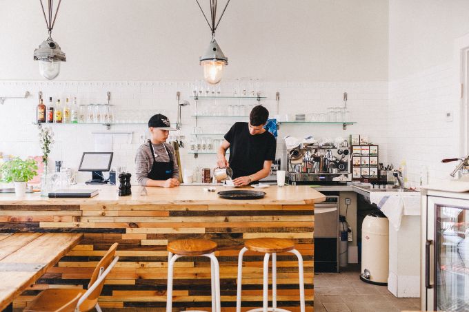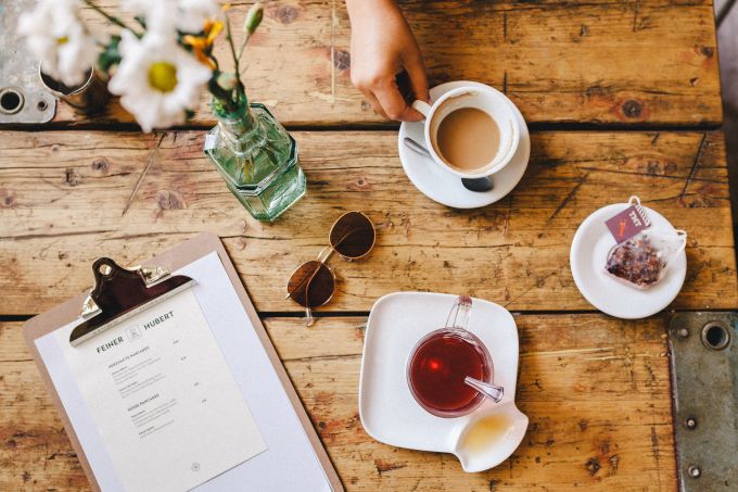 Meine Freundin entscheidet sich für das French Toast, ich mich für die "Feine Marie" mit Buttermilch-Lavendel-Pancakes, Bourbon Vanille, Blaubeerkompott und weißer Schokolade. Dazu nehmen wir einen Kaffee mit Sojamilch und einen Tee von "Trink Meer Tee", da der frische Orangensaft gerade aus ist. "Sorry, wegen des Saftes", sagt Yannick, "ein wenig improvisiert sind wir hier noch." Das fällt einem aber bei der tollen Einrichtung, für die Haidar verantwortlich ist, gar nicht auf.