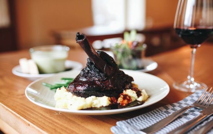 Ich bestelle die Lammhaxe mit grünen Bohnen und Kartoffelstampf für faire 9,50 Euro. Sie kommt inklusive kleinem Salat oder einem Traum von einem Lauchsüppchen. Dazu gibt es selbstgebackenes Brot mit feiner Kreuzkümmelnote. Die Haxe beeindruckt nachhaltig. Das saftige Lamm fällt zart vom Knochen, die Bohnen sind superknackig, die Bratensauce ist eine perfekte Balance aus fruchtig, intensiv herb und kräftig-würzig. Alles ist exakt auf den Punkt. Auch mit dem vegetarischen Menü für 7,50 Euro kann die Küche punkten: Die butterzart schmelzenden Gnocchi mit knödelweichem Kern an frischem Pesto schmecken herausragend gut. Einfach, aber alles andere als langweilig.